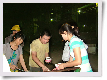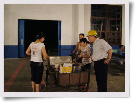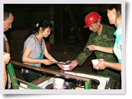 今夏持續(xù)高溫,自7月21日晚上起,湖南湘東化工機械有限公司35名機關(guān)人員堅持40天主動服務(wù)生產(chǎn)一線,每晚為戰(zhàn)斗在生產(chǎn)一線的現(xiàn)場施工人員送去冷飲等防暑降溫物資。 圖為7月21日晚上9點多鐘公司辦公室的員工在不銹鋼分廠等車間送冰綠豆粥的現(xiàn)場。(王慧卉)